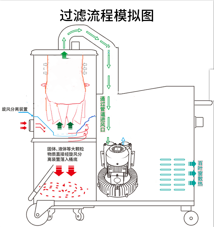 ⑥ 工廠用吸塵器動(dòng)力系統(tǒng)為保證設(shè)備的高壓動(dòng)力、持續(xù)續(xù)航。風(fēng)機(jī)方面采用國際先進(jìn)的精鑄渦輪風(fēng)泵,.此款風(fēng)泵采用了風(fēng)冷式雙旁路(Bypass)的散熱系統(tǒng),這樣的設(shè)計(jì)可以讓電機(jī)和風(fēng)泵在使用過程中一直保持恒 溫狀態(tài),使電機(jī)可連續(xù)工作24小時(shí)。 風(fēng)泵進(jìn)、出風(fēng)口處安裝有多頻消音器,讓您有一個(gè)安靜的工作環(huán)境。電機(jī)采用國產(chǎn)西門子電機(jī),寬壓雙頻(50/60Hz),高可靠、低噪音、長(zhǎng)壽命。